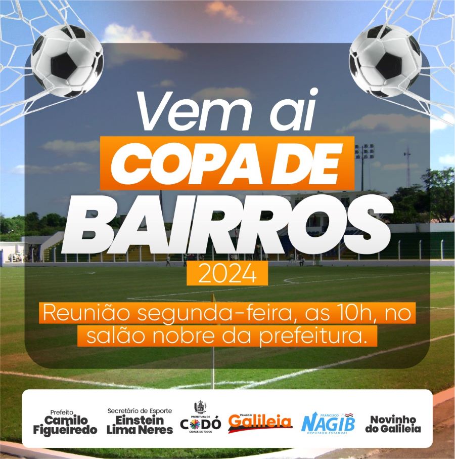 Atenção: organizadores e promotores do futebol amador de Codó, vem aí a Copa de Bairros 2024. Para alinhar os detalhes da organização, haverá uma reunião crucial na próxima segunda-feira, às 10h, no Salão Nobre da Prefeitura. Representantes de times, líderes comunitários e todos os interessados estão convidados a participar. Será o momento para discutir regulamentos, formatos de competição e demais preparativos para o torneio.