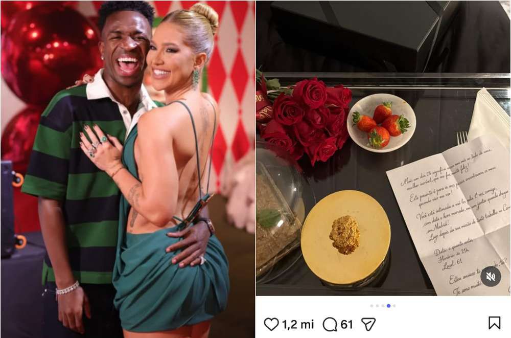 Virginia e Vini Jr. completam três meses de namoro nesta quarta-feira, 28, e, o jogador do Real Madrid surpreendeu a amada com mimos e uma declaração de amor. O jogador deu um presente da grife francesa Saint Laurent, provavelmente um sapato e escreveu no bilhete: