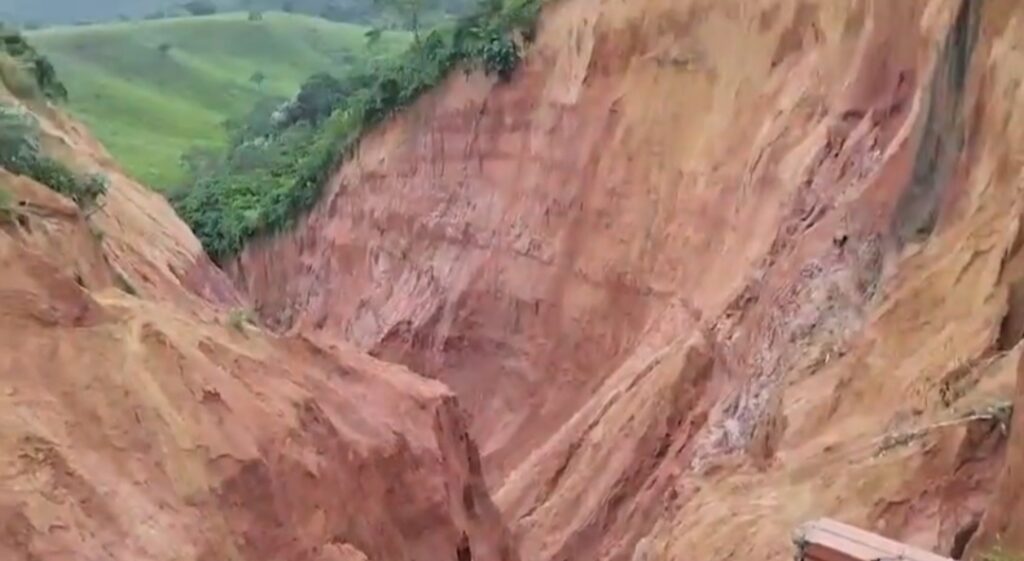 Um vídeo viralizado nas redes sociais mostra uma dessas voçorocas avançando pela cidade, ameaçando engolir casas na região.