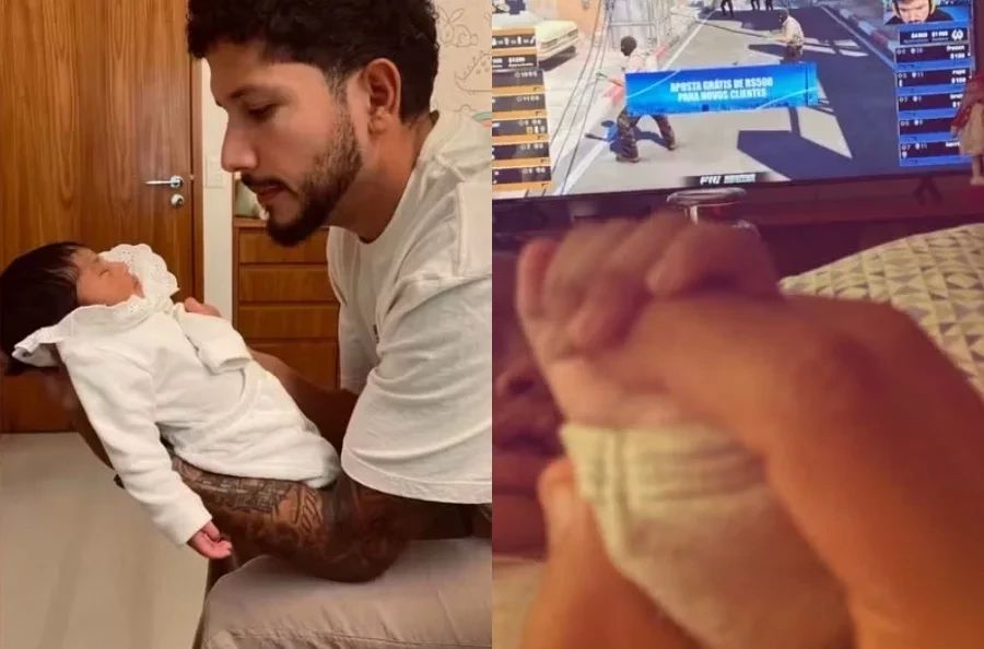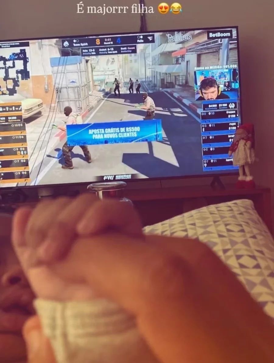 Na imagem, Yuri aparece segurando a mãozinha da bebê enquanto assiste a um vídeo na televisão. “É major filha”, escreveu o jogador na foto. Em entrevista recente à Quem, Iza abriu o jogo sobre o suporte da família após o nascimento da filha.
